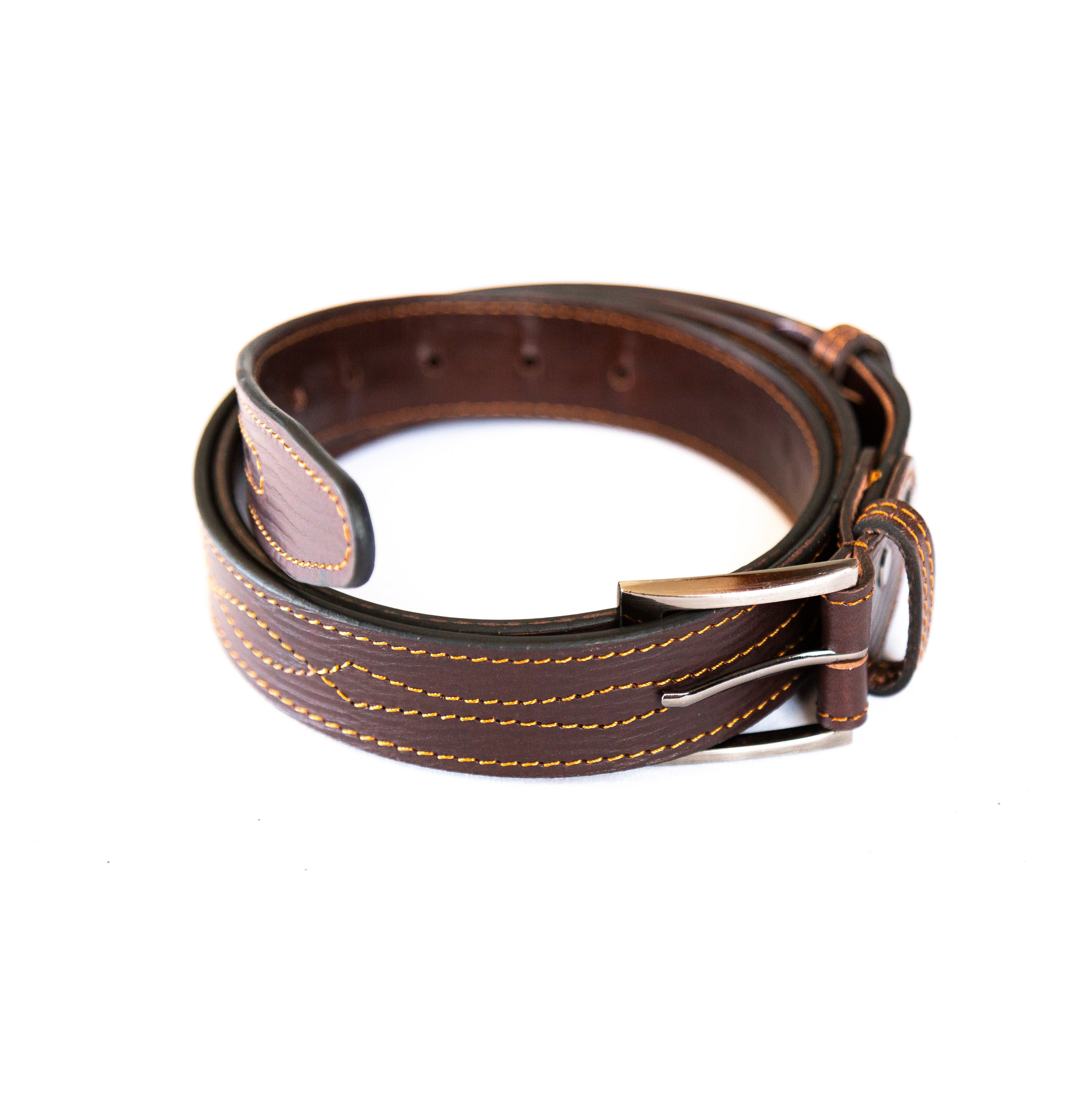 cinturón en piel vaquetilla burdeos de máxima calidad, de 35 mm de ancho, con adornos cosidos.